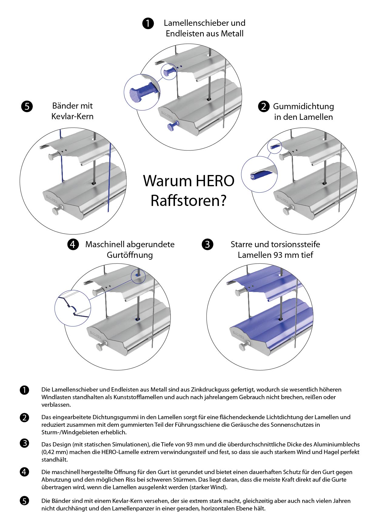 Der HERO-Kleinflächenraffstore (bis zu 5 Quadratmeter) schnitt im Test besonders gut ab und übertraf die maximale Windklasse 6, d.h. eine Windausdauer von 108 km/h, deutlich. Der großformatige Raffstore (400 x 280 cm (B x H)) bestand den Test ohne mechanische Beschädigung, wies jedoch eine höhere Durchbiegung auf, so dass die Lamellen aus den Führungsschienen fielen. Nach dem Wiedereinsetzen des Lamellenpanzers in die Führungsschienen funktionierte er wieder einwandfrei.